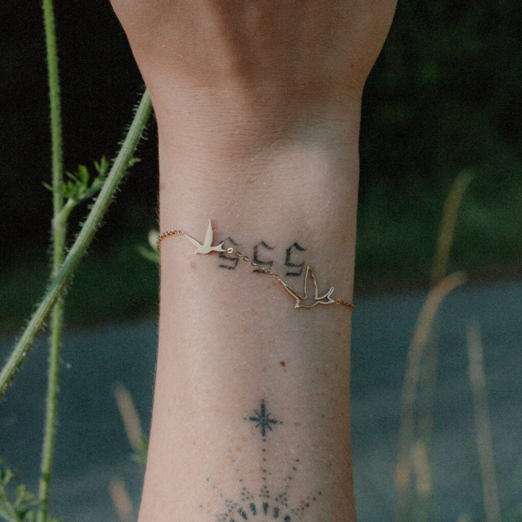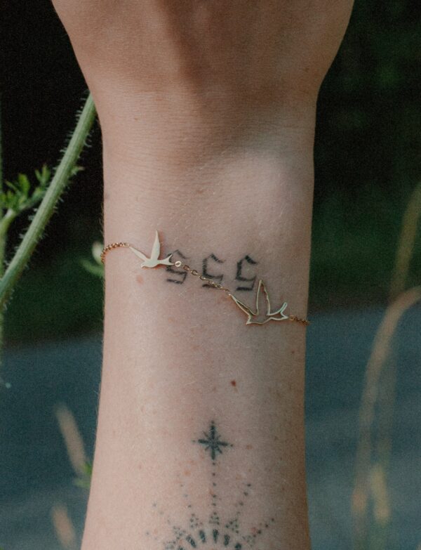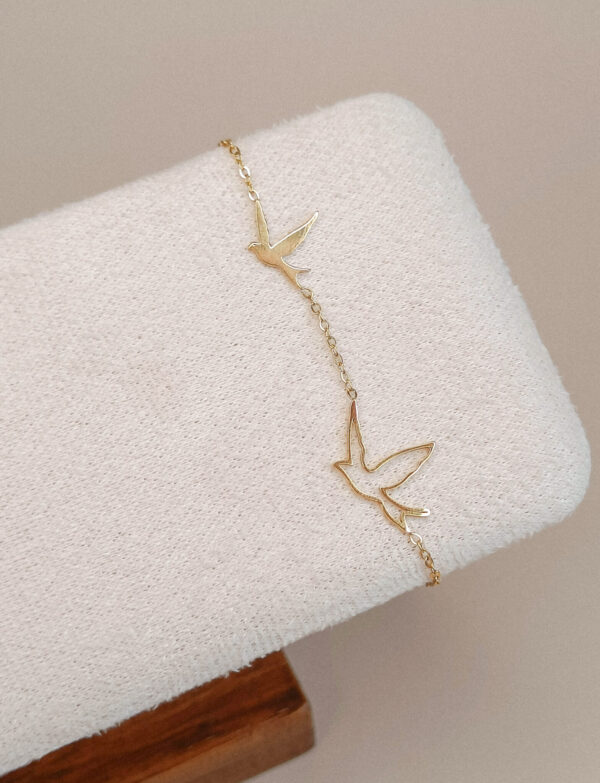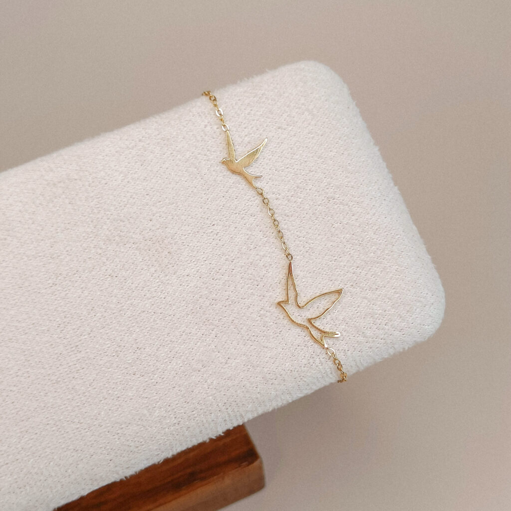 Gouden stainless steel armband met twee vogels die naast elkaar vliegen. De vogels staan symbool voor vrijheid, verbondenheid en onafhankelijkheid. Een subtiele armband met veel betekenis. De armband is verstelbaar dankzij het verlengkettinkje van 3 cm.
