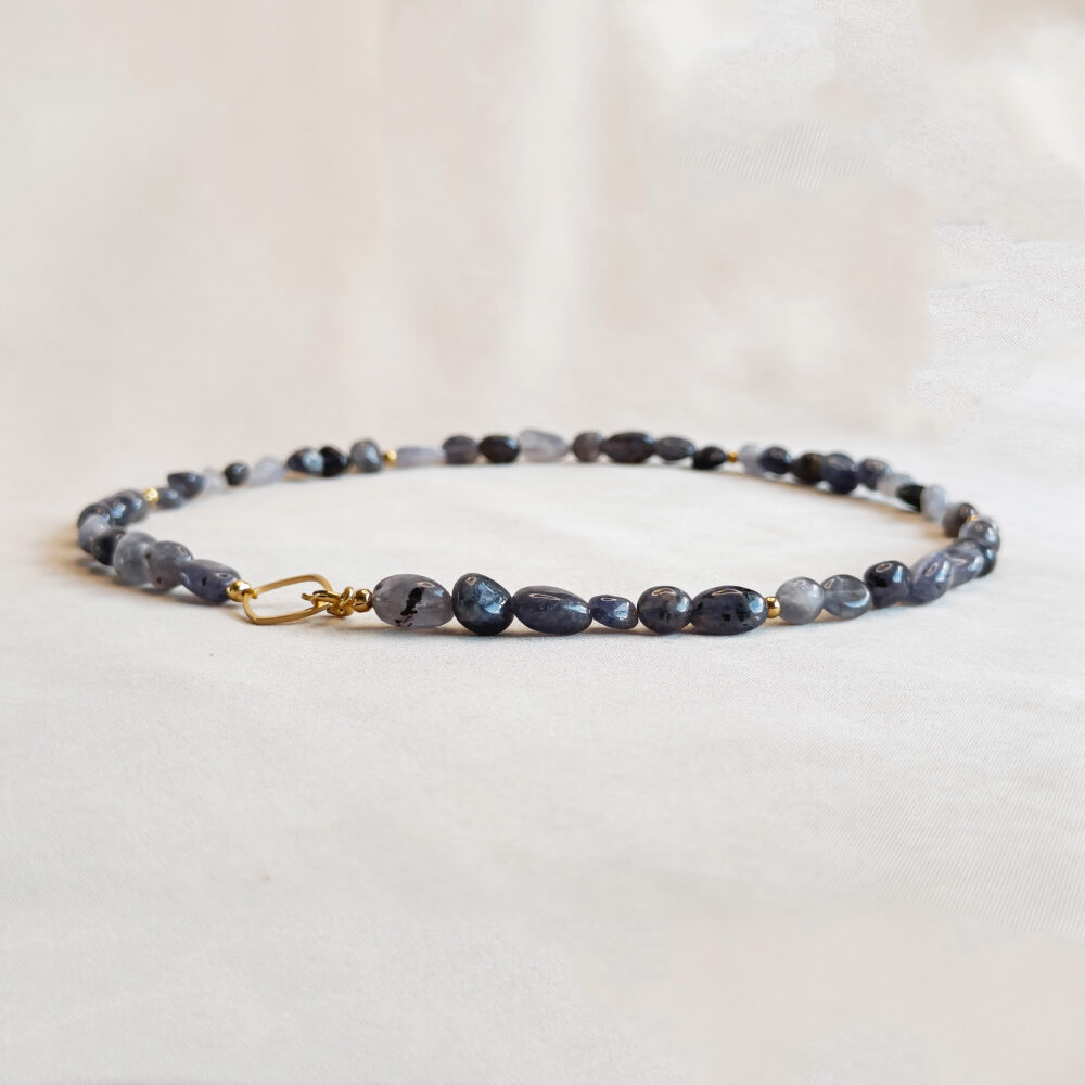 Ketting van Iolietkralen met een onregelmatige vorm (ca. 5–7 mm), afgewerkt met een rond gevormde vierkanten sluiting van 18k PVD-gecoat staal. De kleur van Ioliet varieert van lila tot grijzig paars, afhankelijk van de lichtval. De lengte van de ketting is ongeveer 43 cm.