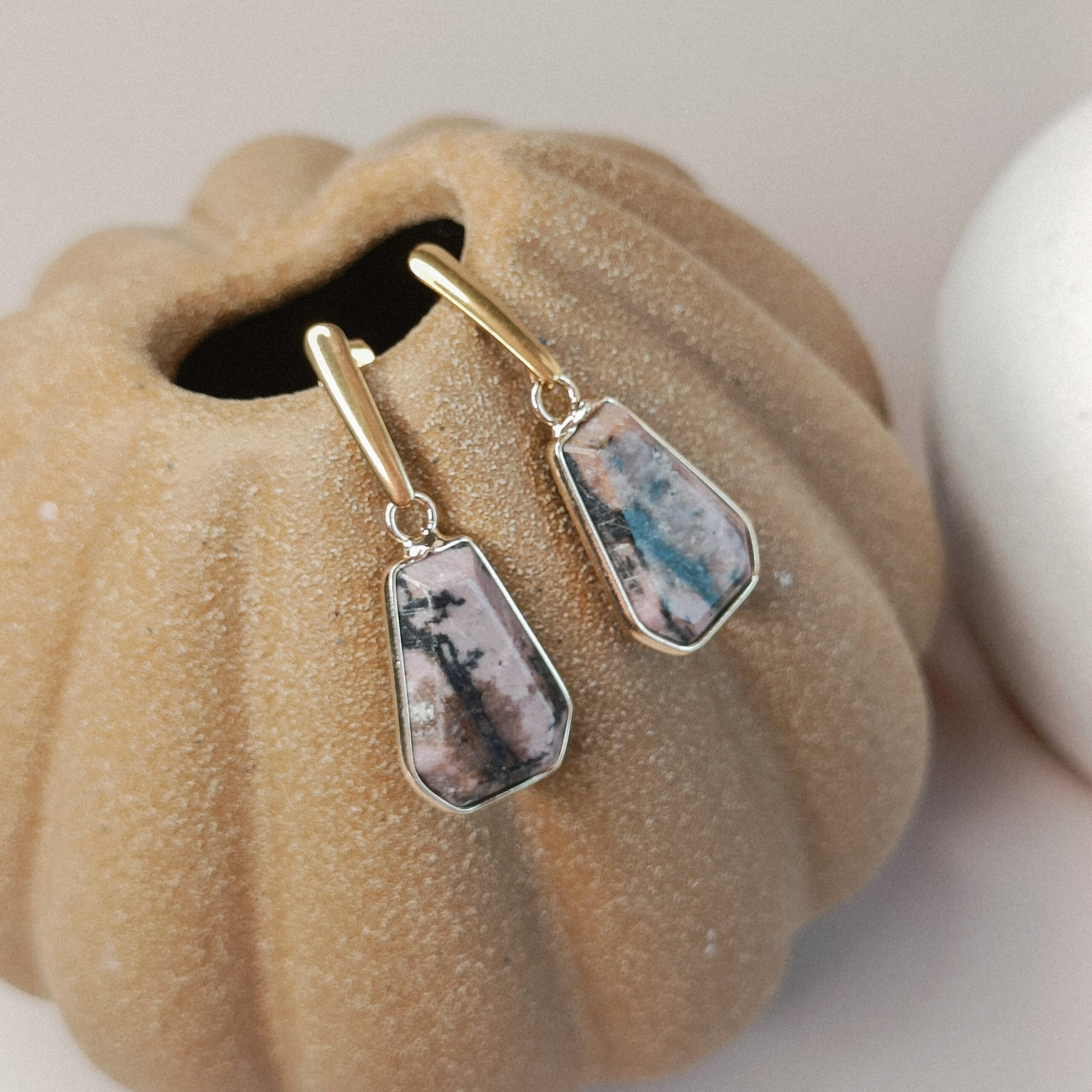 Elegante gouden oorbellen met langwerpige facet geslepen hangers van Rhodoniet, 15 x 26 mm groot. Rhodoniet staat voor compassie, emotionele balans en het helen van het hart. Door de gebruik van natuurlijke edelstenen is er variatie mogelijk in patroon. Er wordt altijd een mooi matchend paar uitgezocht.