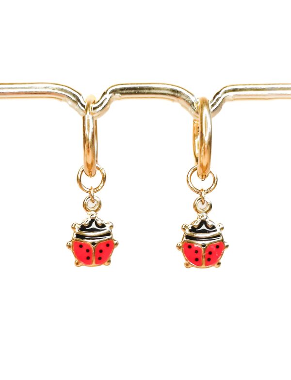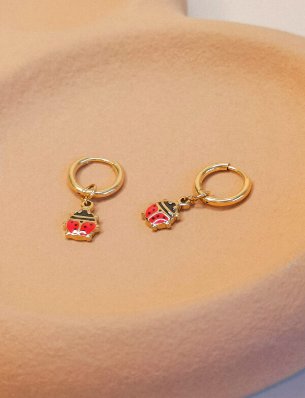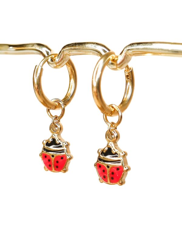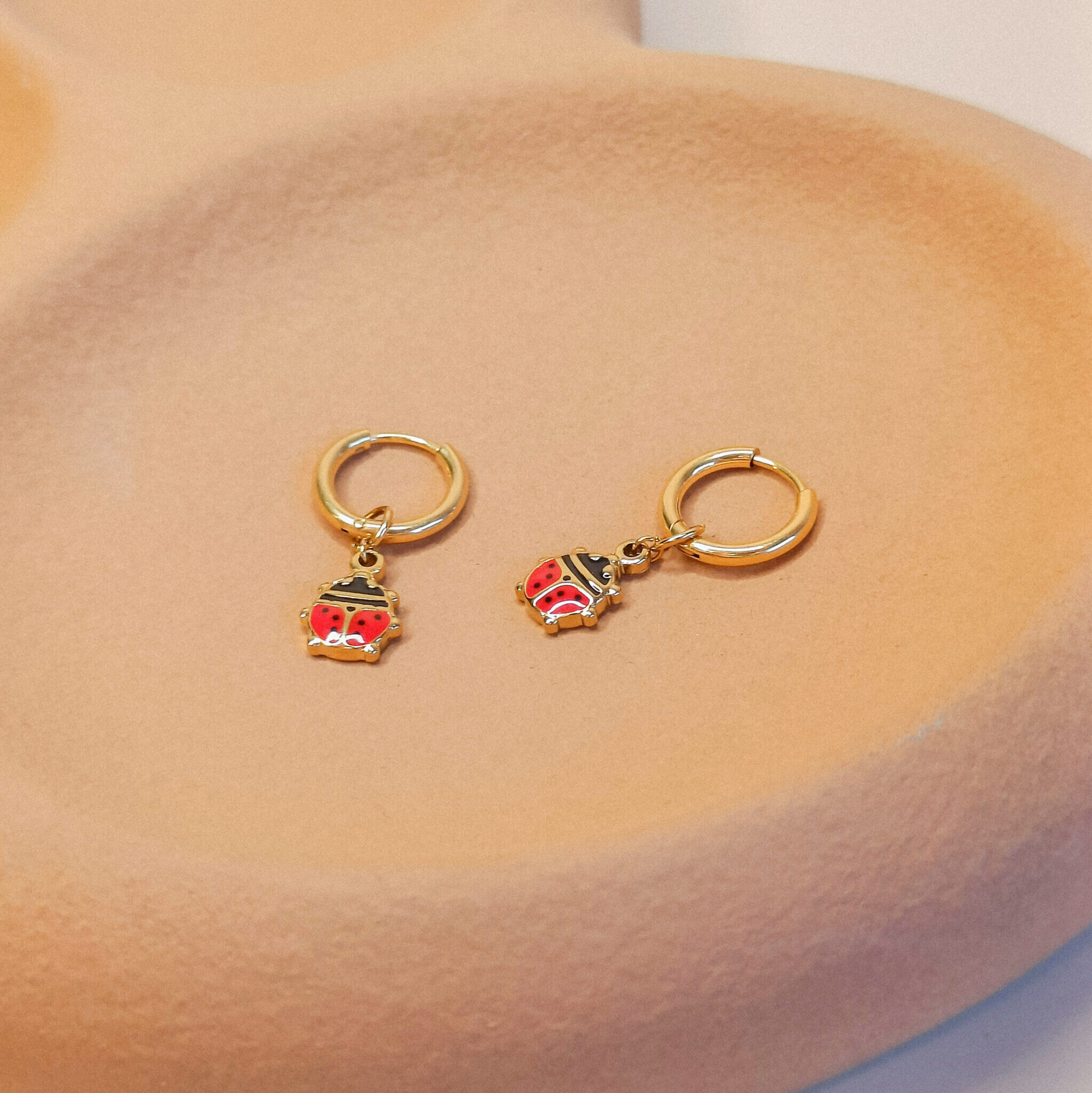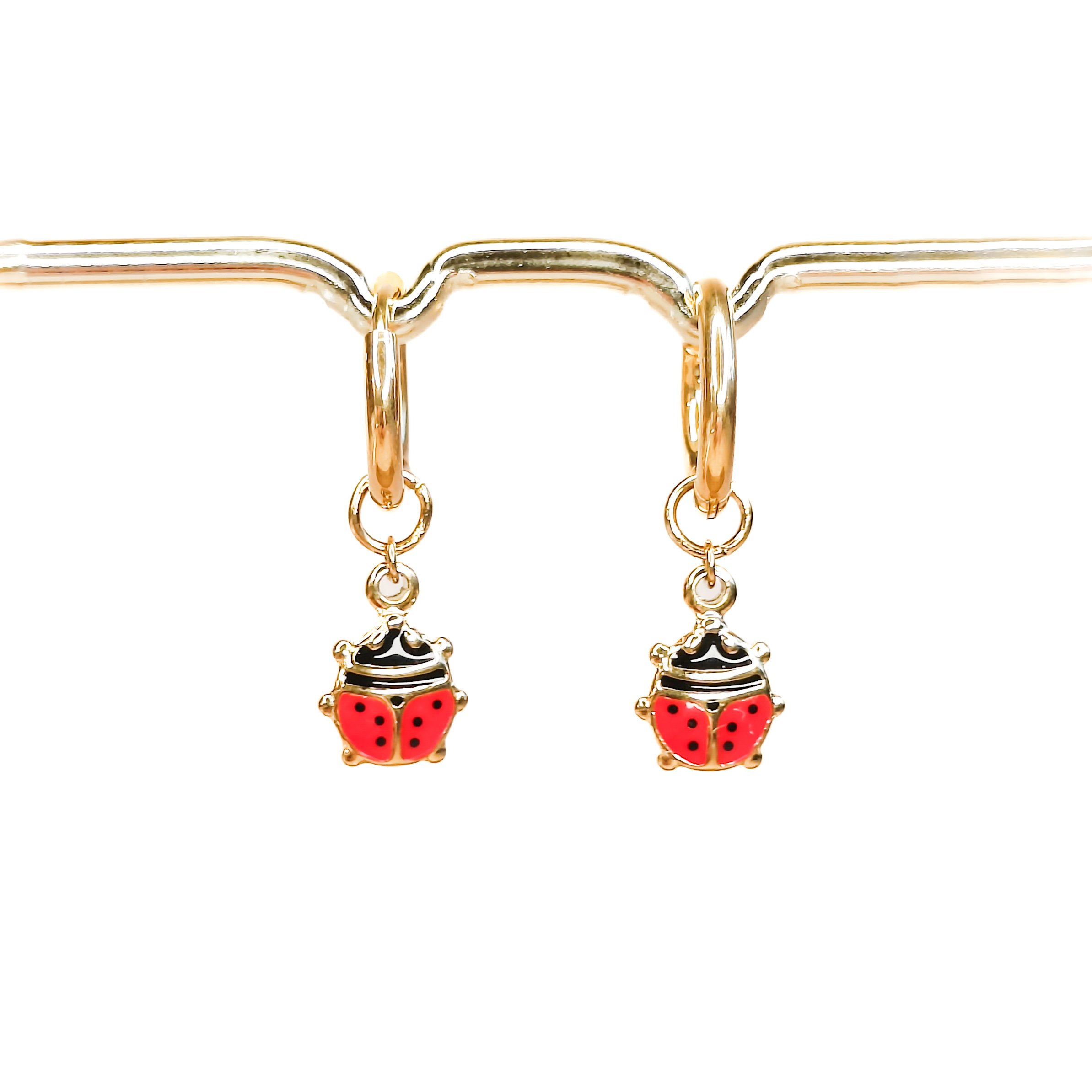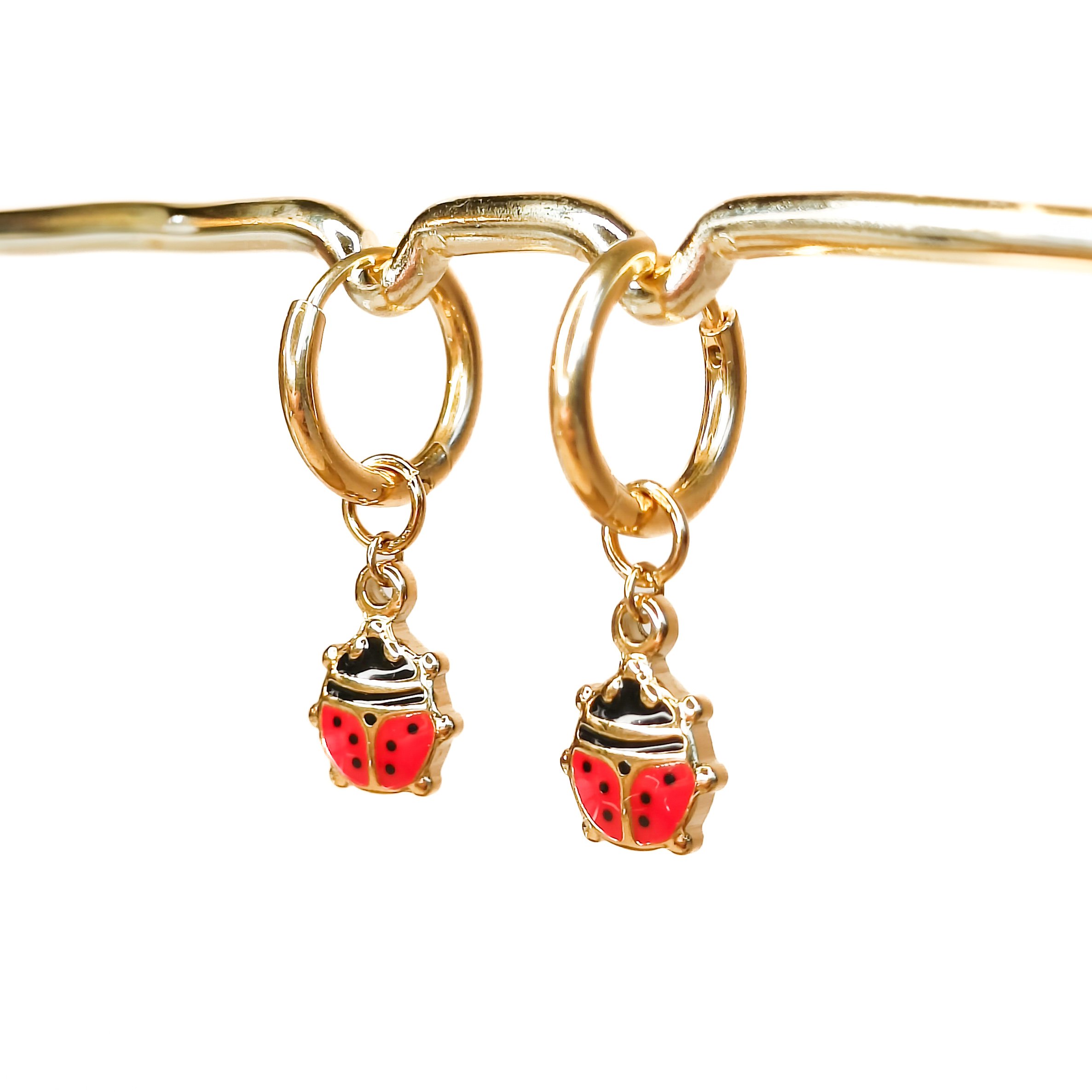 Gouden oorringen met een vrolijk hangertje in de vorm van een lieveheersbeestje. De bedel is rood met zwarte stippen en 12 bij 8,5 mm groot. Verkrijgbaar met hoops van 10 mm (standaard damesmaat) of 8 mm voor kinderoren. Gemaakt van 18k PVD-gecoat staal: stevig, kleurvast en vriendelijk voor de huid.