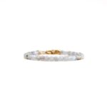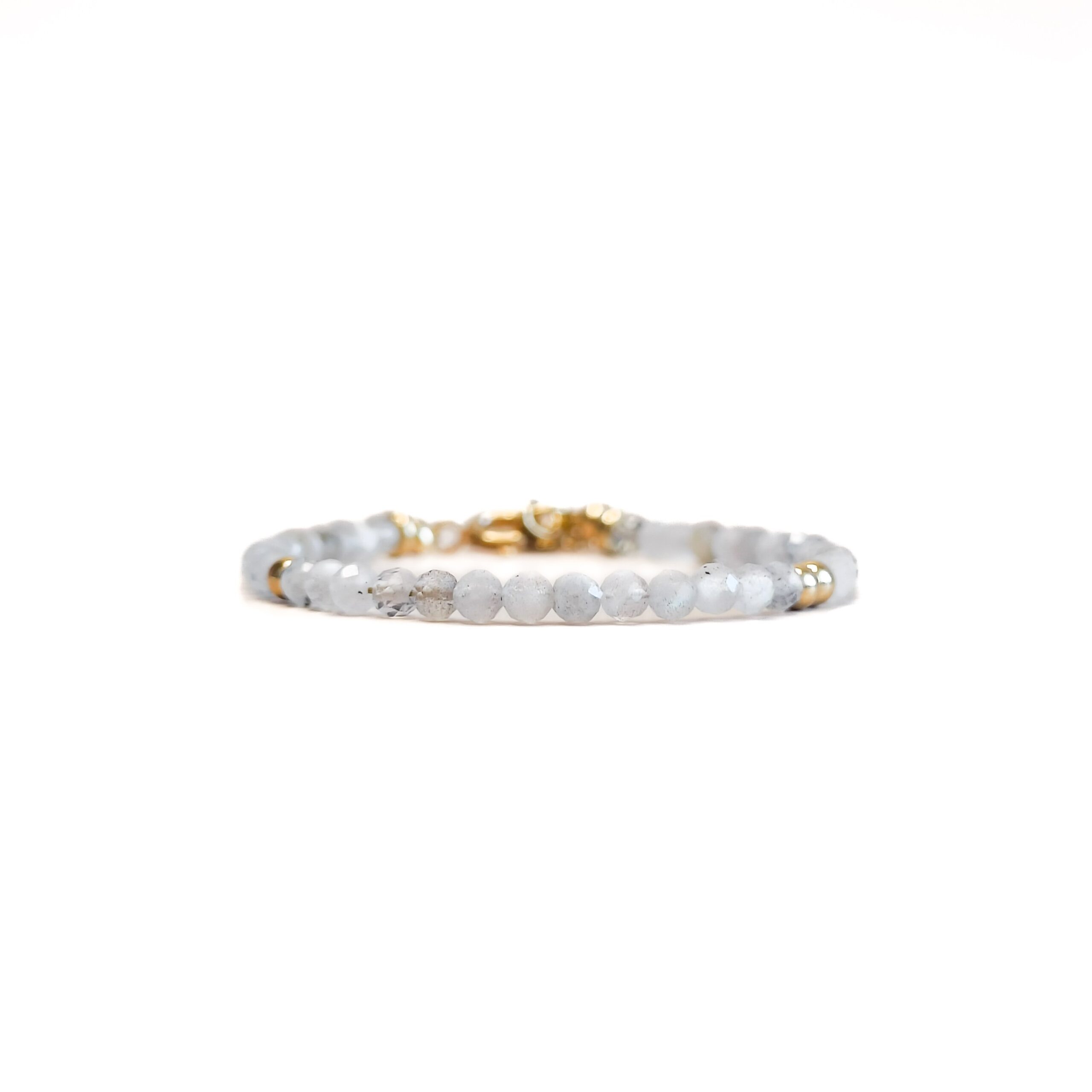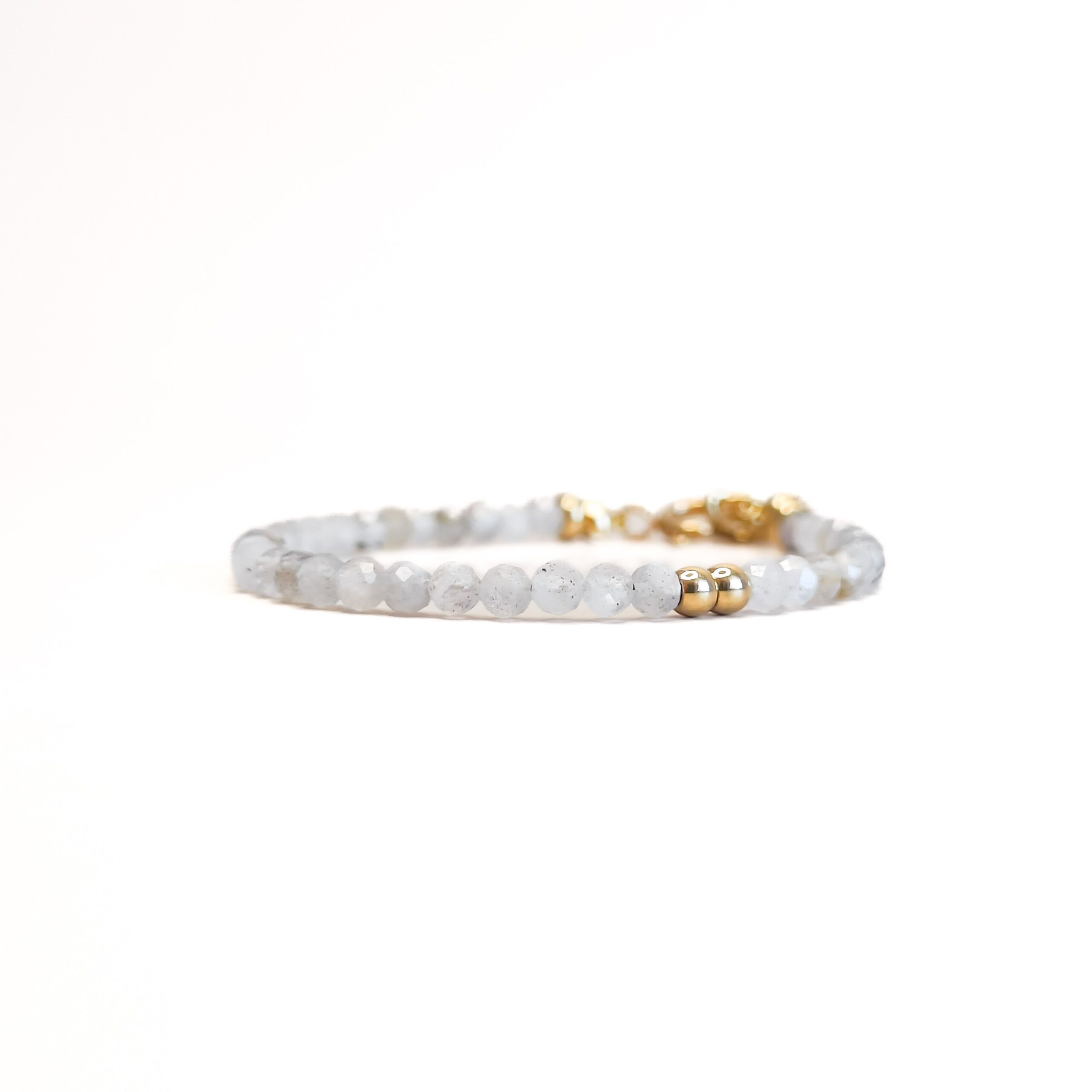 Deze kinderarmband is gemaakt van 3 mm labradoriet. Grijze steentjes met een zachte grijs/blauwe glans, gecombineerd met kleine gouden kraaltjes.