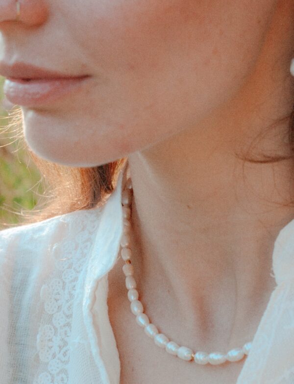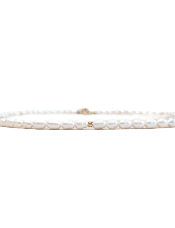 Gouden ketting met zoetwaterparels van ca. 5–6 mm, afgewisseld met kleine gouden kraaltjes. De ketting is ca 42 cm lang en heeft een verlengstukje van 5 cm. Elke parel is uniek van vorm en zoetwaterparels staan symbool voor zuiverheid, harmonie en vrouwelijke energie.
