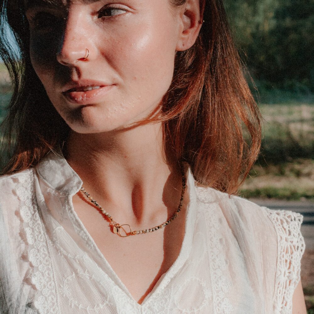 De Sparkling Dalmatiër Jaspis Ketting is gemaakt van 3 mm facet geslepen kralen. Het bijzondere patroon van dalmatiër jaspis, met z’n speelse stippenpatroon, geeft deze ketting een unieke uitstraling. Dalmatiër Jaspis staat voor rust, evenwicht en stabiliteit. De ketting sluit met een elegant gevormd rond vierkant slotje van 18k PVD-gecoat stainless steel en heeft een lengte van ca. 43 cm. Draag haar solo voor een subtiel accent of combineer met andere kettingen.