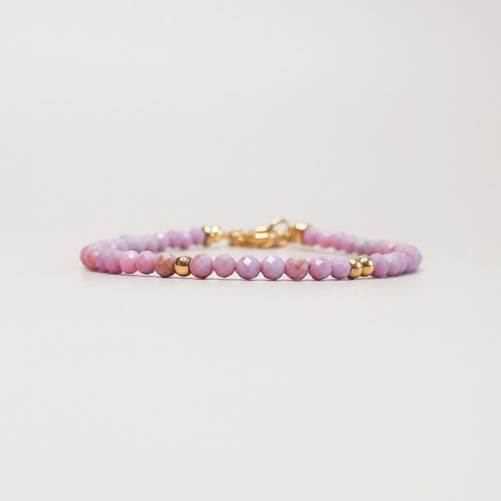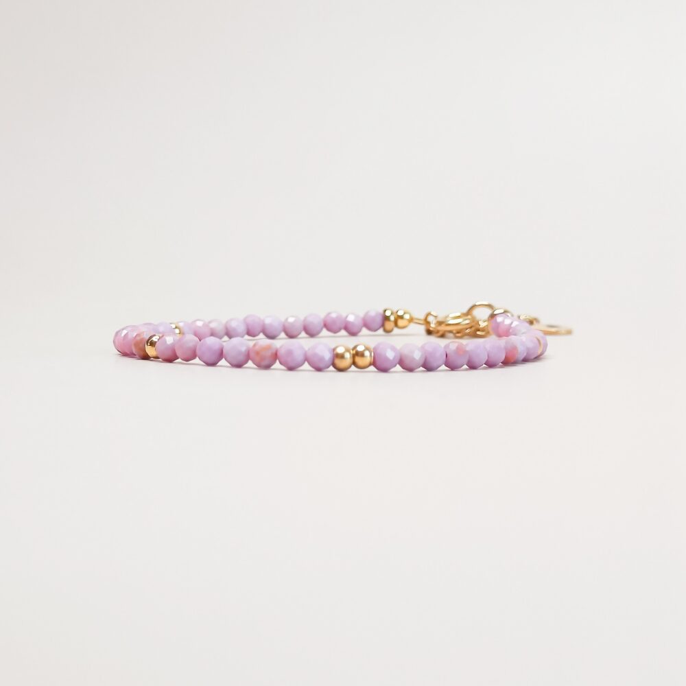 Armband van kleine facetgeslepen lepidoliet kralen van 3 mm groot. De armband is 16 cm lang en heeft een verlengstukje van 5 cm. Lepidoliet staat voor kalmte, emotioneel evenwicht en vernieuwing. Met gouden 18k PVD gecoat stainless steel details.