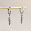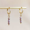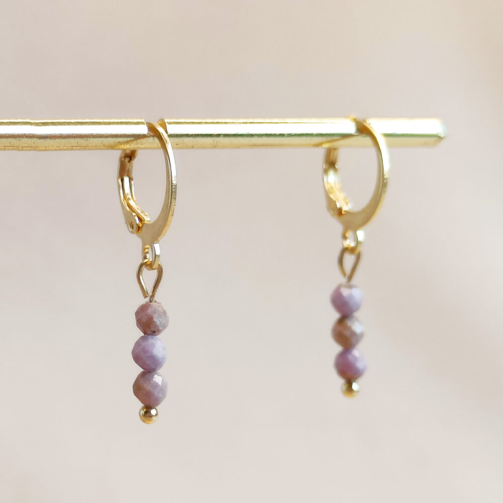 Oorbellen met kleine facetgeslepen lepidoliet kralen van 3 mm groot. De steentjes hangen in een rijtje onder een 10 mm hoop. De totale lengte van de oorbellen is 30 mm. Lepidoliet staat voor kalmte, emotioneel evenwicht en vernieuwing. Verkrijgbaar in goud (18k PVD gecoat stainless steel) of zilver (stainless steel).