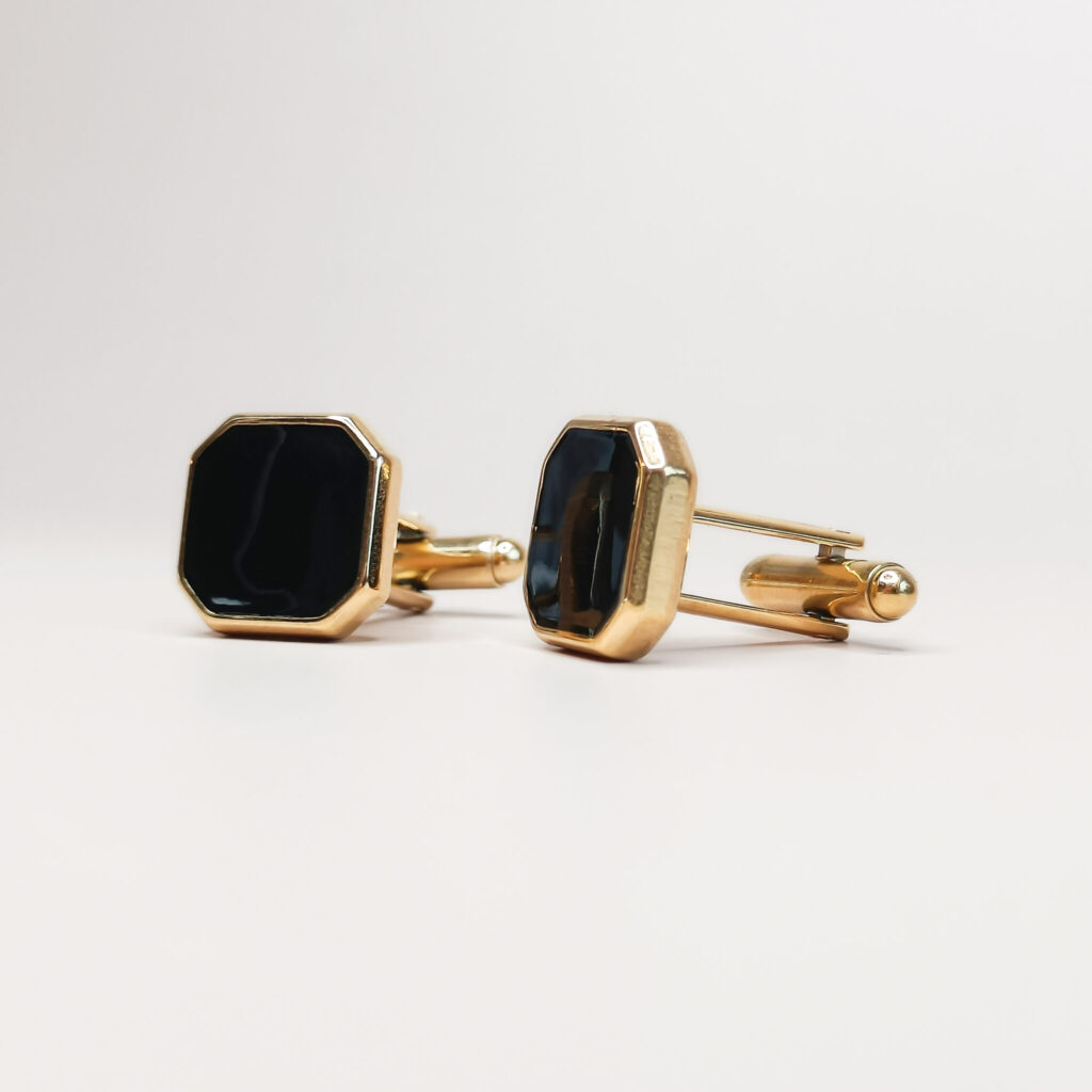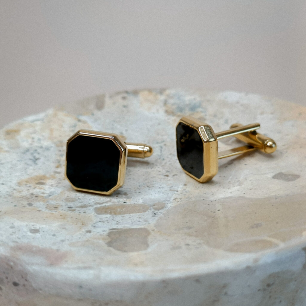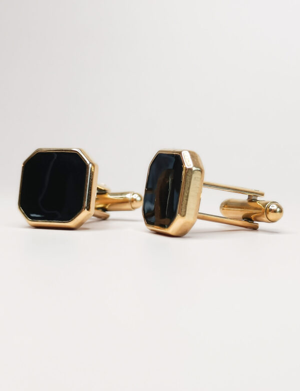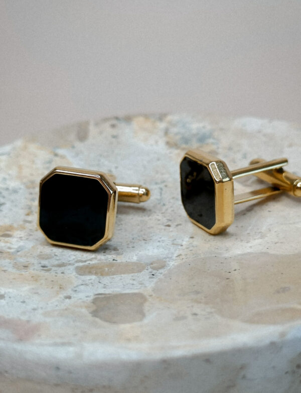De Square Manchetknopen Zwart hebben een Zwart Agaat steen in een achthoekige omlijsting in het goud. De manchetknopen zijn gemaakt van 18k PVD-gecoat stainless steel.