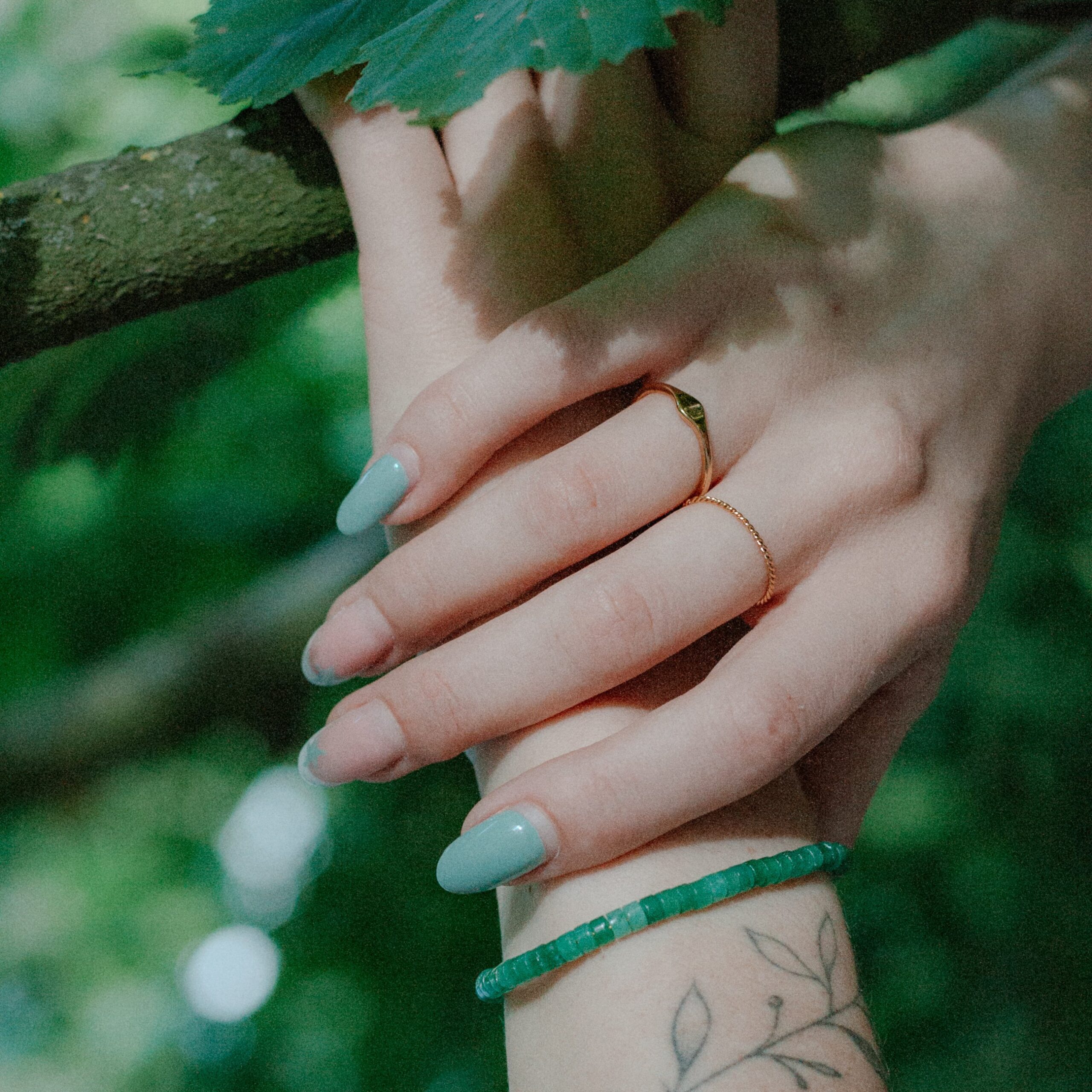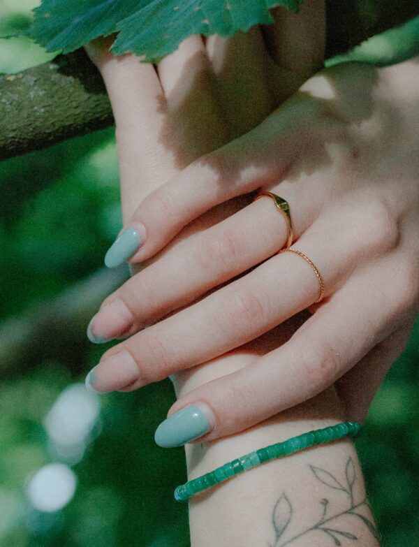 Het model op de foto draagt de Tenue Armband Groene Jade