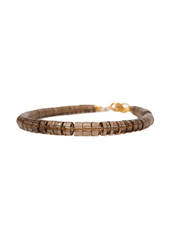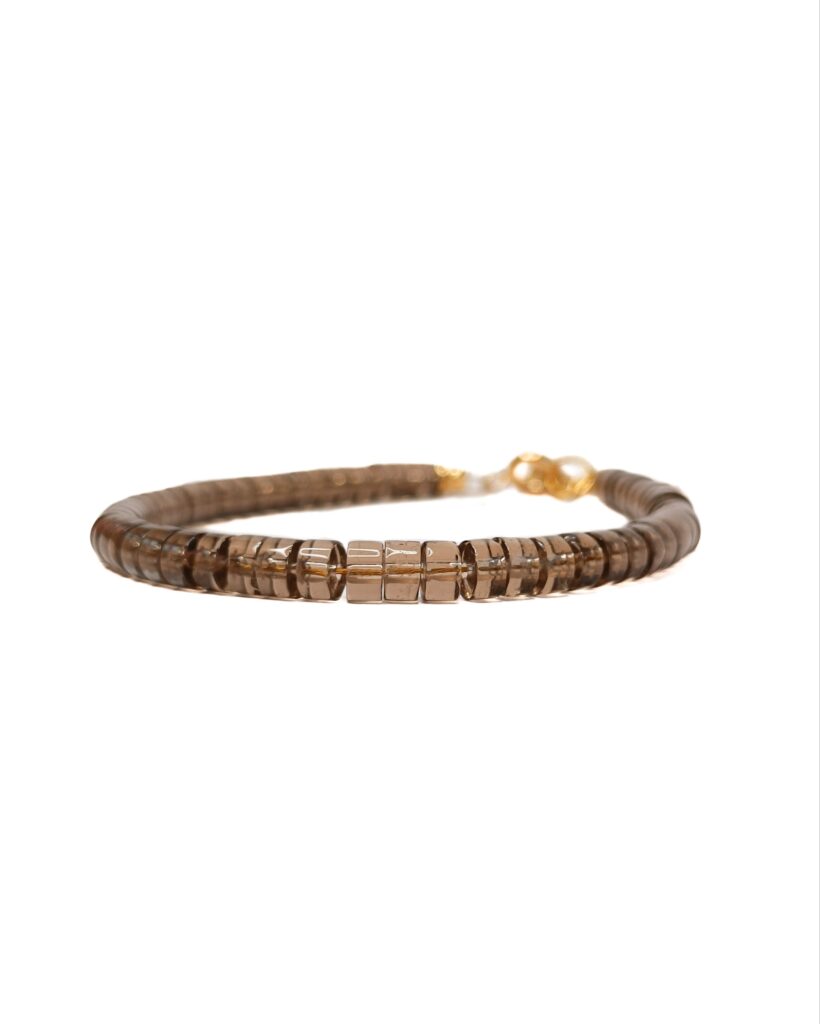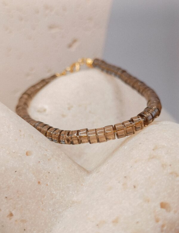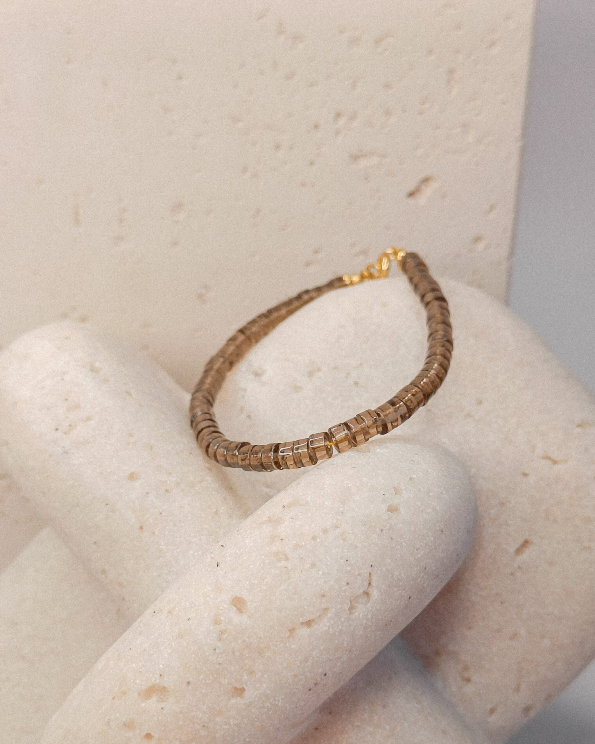 De Tenue Armband Rookkwarts is gemaakt van kleine, platte kraaltjes van 2×4 mm. Rookkwarts is een half transparante grijze steen en staat symbool voor bescherming en rust. De armband sluit met een slotje van 18k PVD-gecoat stainless steel en is verstelbaar van ca. 16 tot 21 cm.