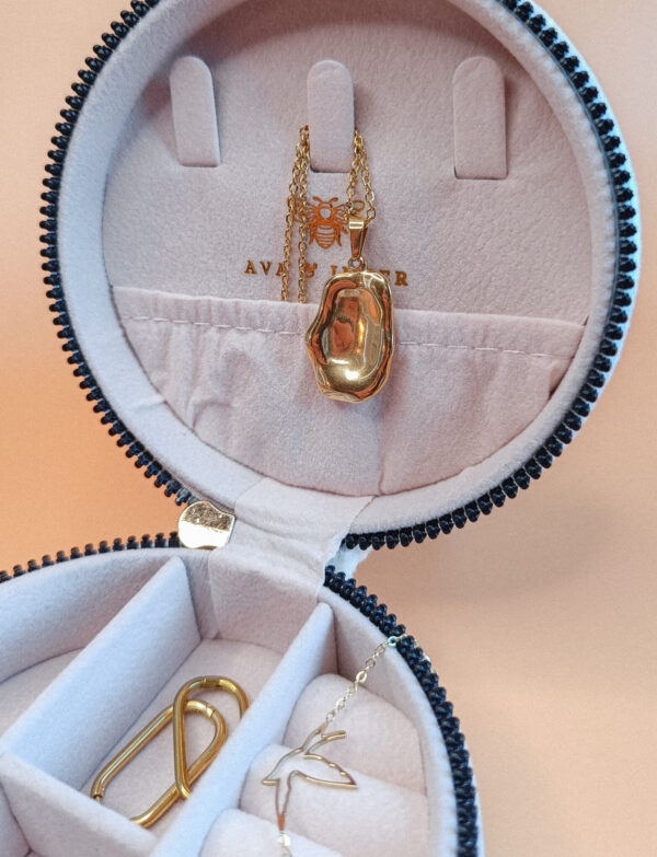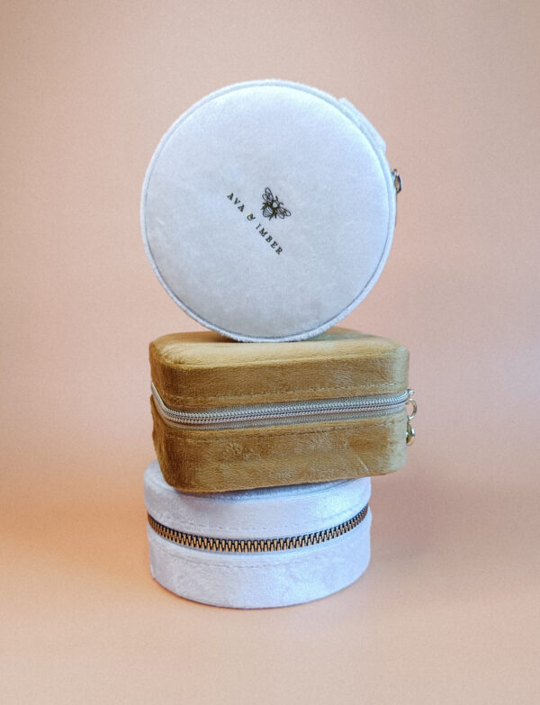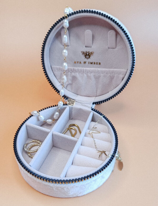 Deze ronde sieradendoos heeft een zachte parelwitte velvet stof aan de buitenkant en de binnenkant is bekleed met een fluweelzachte beige voering. Er zijn diverse vakjes om ringen, kettingen, armbanden en oorbellen overzichtelijk in te bewaren. Het elastische opbergvak bovenin en de speciale sleuven voor ringen of studs zorgen ervoor dat alles veilig op zijn plek blijft.