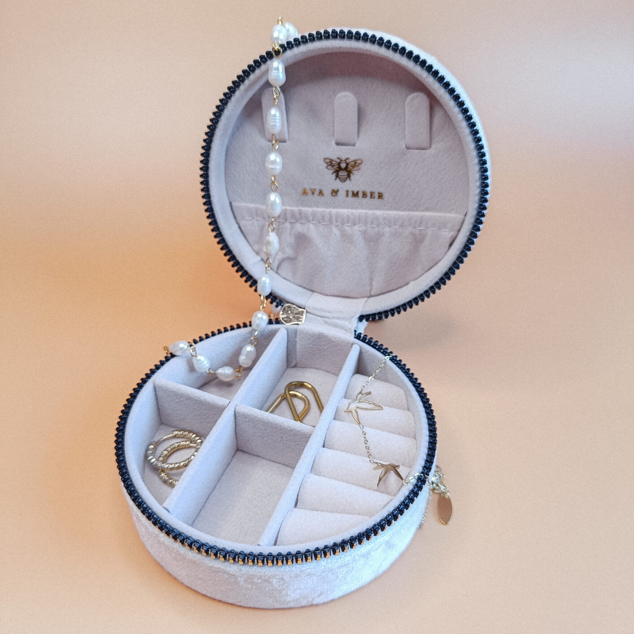 De Travelcase Round Pearl is de perfecte reisgenoot voor je favoriete sieraden. Met een afmeting van 10 x 10 x 5 cm is deze compacte witte sieradendoos ideaal om mee te nemen in je tas of koffer, zonder dat je sieraden in de knoop raken of beschadigen.