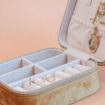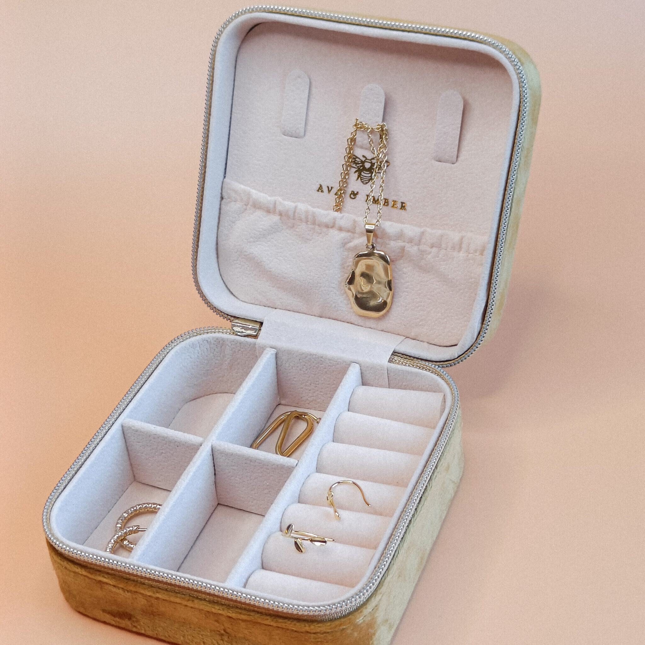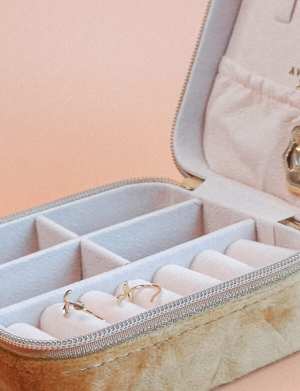 Deze sieradendoos heeft een warme, okergele velvet stof aan de buitenkant en de binnenkant is bekleed met een fluweelzachte beige voering. Er zijn diverse vakjes om ringen, kettingen, armbanden en oorbellen overzichtelijk in te bewaren. Het elastische opbergvak bovenin en de speciale sleuven voor ringen of studs zorgen ervoor dat alles veilig op zijn plek blijft. De tussenwanden van de vier kleine vakjes kunnen eruit gehaald worden waardoor je ook grotere armbanden mee kan nemen.
