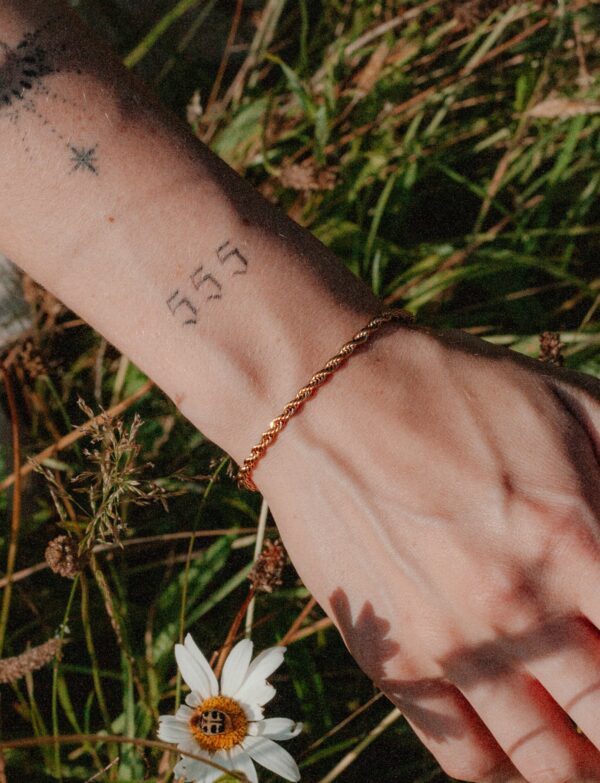 Het model op de foto draagt de Twist Armband Goud.