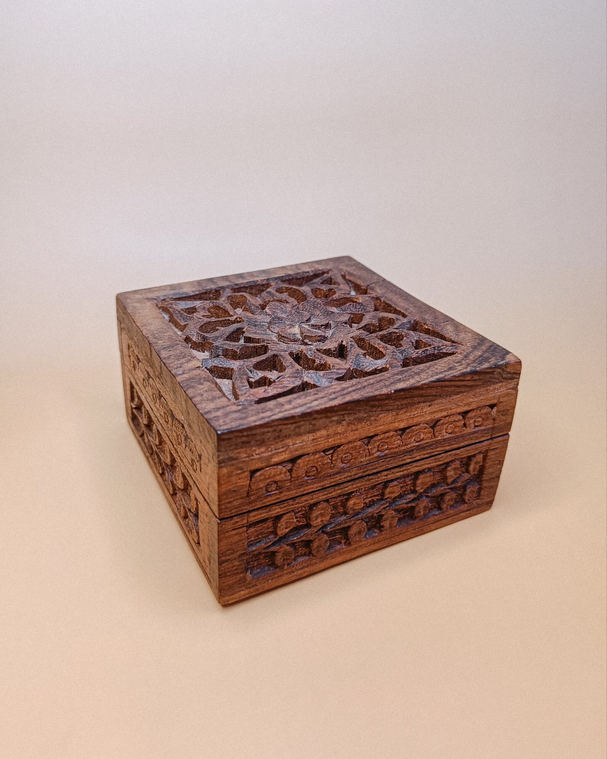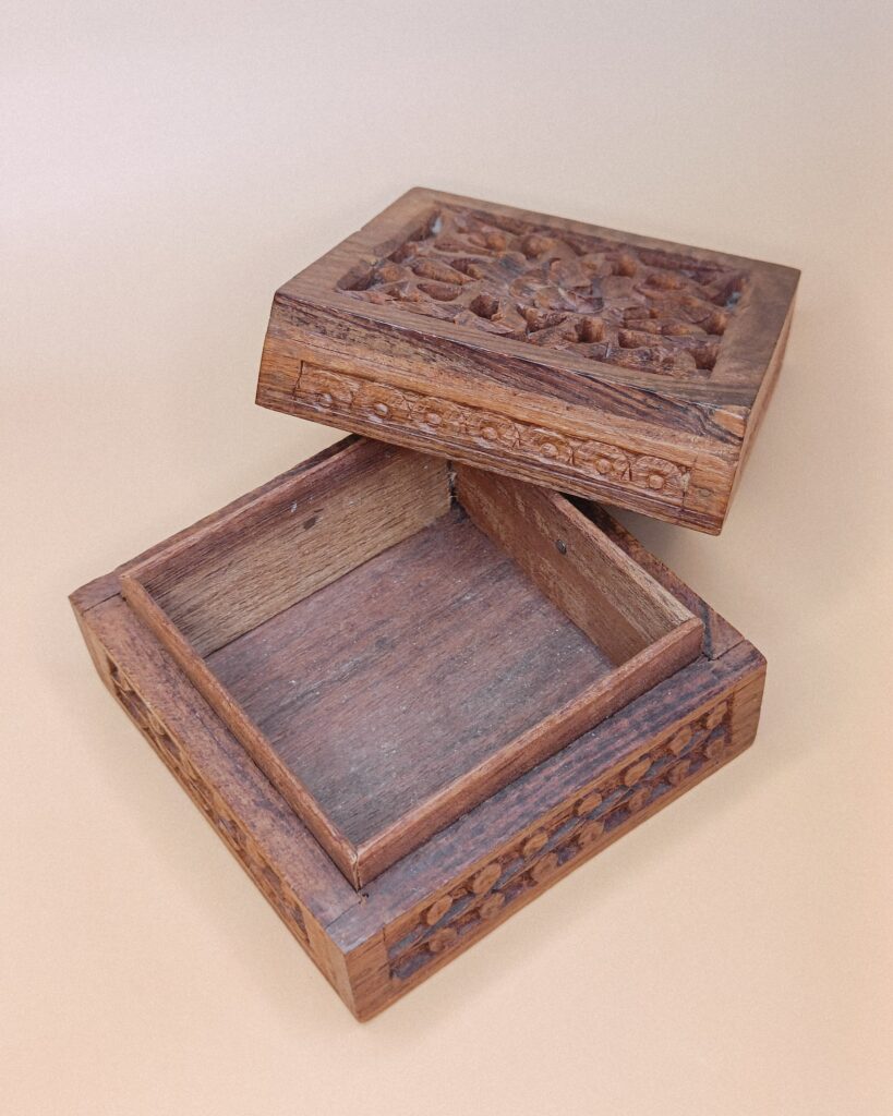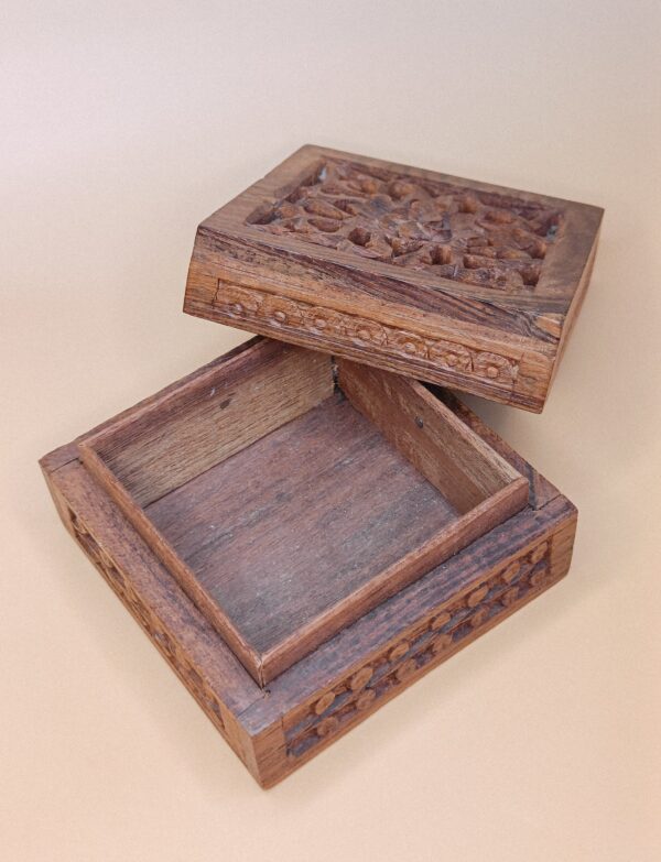 Het doosje is 10 x 10 x 5.7 cm groot en gemaakt van hout.